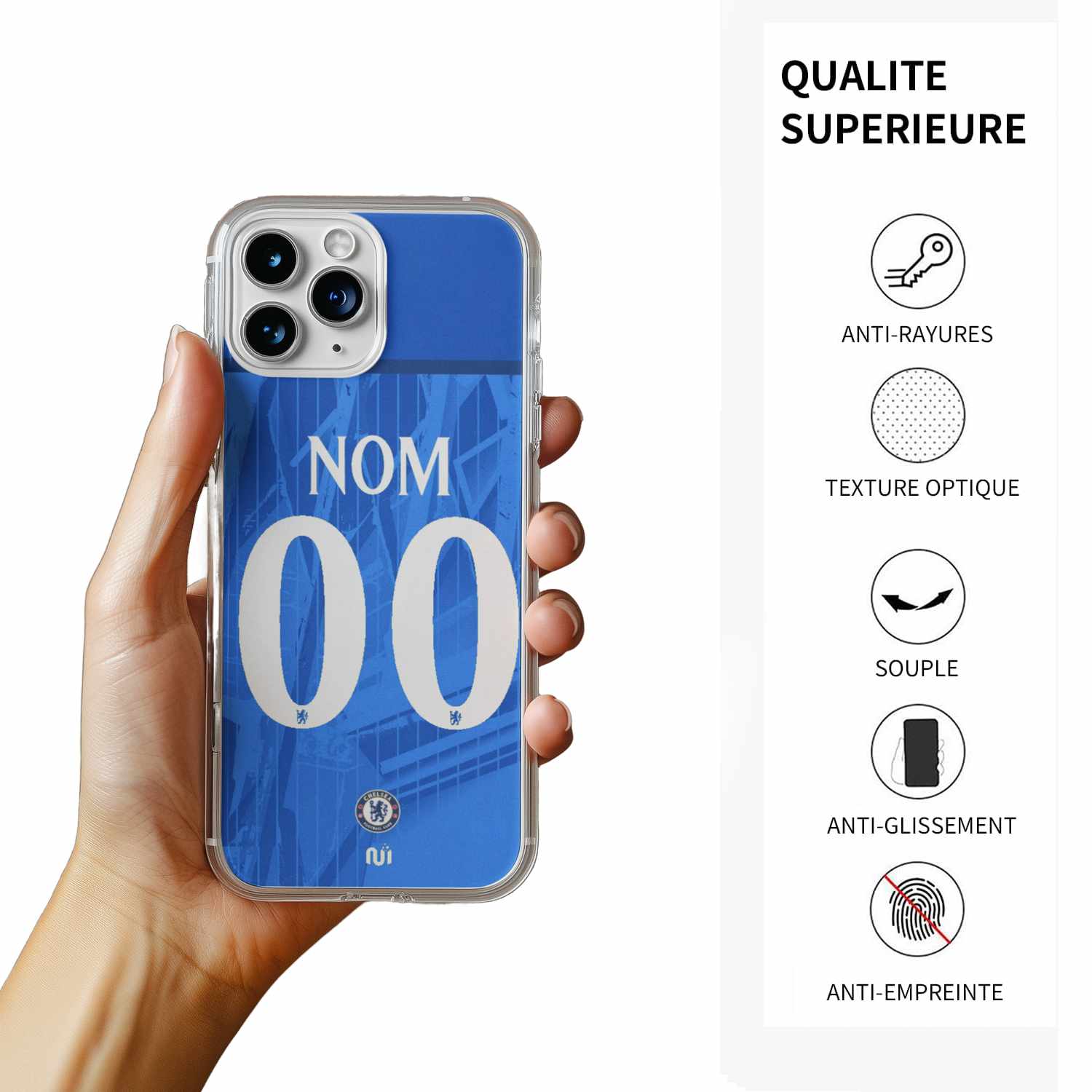 . Conçue spécialement pour les supporters des Blues, cette coque unique reproduit le design emblématique du maillot domicile avec une finition moderne et élégante.